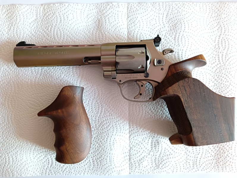 Der Target Trophy mit 6 Zoll Lauf im Kaliber .357 Magnum bzw. .38 Spezial wurde 2016 gekauft, ist in sehr gutem Zustand und kommt mit einem Holzgriff und einem KN Nill Matchgriff.