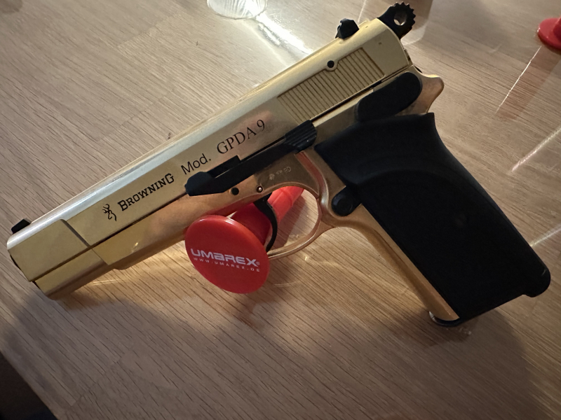Zum Verkauf steht eine Browning Mod. GPDA 9 in Gold, eine hochwertige Schreckschusswaffe im Kaliber 9mm P.A.K.