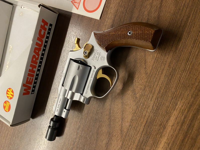 Aus meiner Sammlung biete ich einen sehr schönen Weihrauch HW88 SAW in der seltenen Gold Edition an. Der Revolver befindet sich in einem sauberen, gepflegtem Sammlerzustand und macht auch optisch in der Vitrine sicher noch einiges her. Der Abzug, Hahn und Trommelschieber sind hier echt vergoldet worden, trotzdem handelt es sich um eine den leichten HW88 Super Airweight welcher eine starke Fürwaffe im Kal 9mm Knall ist. Der Rahmen sowie die Trommel wurden hier aus modernem Hochleistungsaluminium gefertigt. Die original Weihrauch Griffschalen sind aus Holz und ebenfalls in tadellosem Zustand. Der SAW hat auch noch die frühere PTB 659, die für ihre hochwertige Qualität und den minimalen Trommelspalt bekannt ist. Hierdurch wird ermöglicht, dass im Falle eines Schusses, so viel Druck wie möglich vorne aus dem Lauf austritt und so wenig wie möglich an den Seiten verloren geht. Kommt inklusive Anleitung, Abschussbecher, Garantie Karte und original Karton. Versende umgehend per DHL nach Geldeingang. Da Privatverkauf keine Garantie oder Rücknahme. Verkauf unter Ausschluss jeglicher Sachmängelhaftung. Alle Angaben nach bestem Wissen und Gewissen.