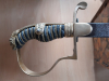 Holzgriff mit schwarzem Leder ummantelt, gut erhaltene Wicklung. Abschluss mit verziertem Griffring