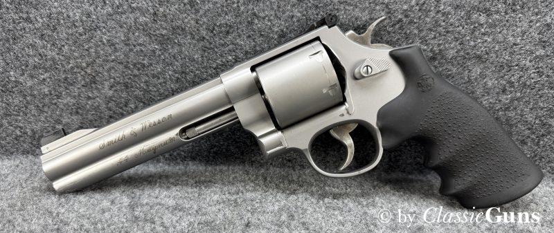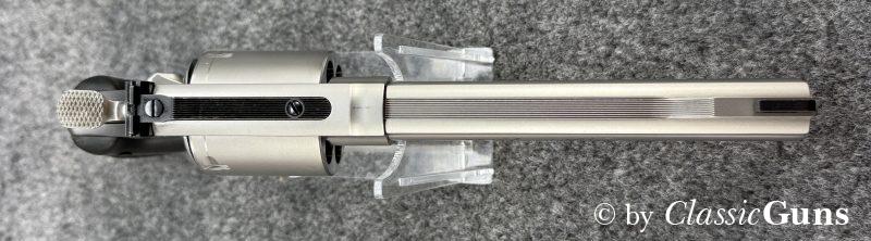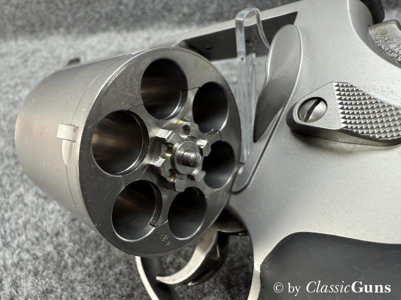6“-Lauf mit neuwertigem Zug-/ Feldprofil, ungeflutete Trommel mit blanken Trommelbohrungen, neuwertige und praxistaugliche Seriengriffe aus weichem Gummi, einwandfreier Schlossmechanismus und hervorragender DA/SA Abzug. Das matt gestrahlte Finish der aus Stainless Steel gefertigten Waffe zeigt ein paar harmlose und unvermeidliche Gebrauchsspuren. Die Schussbelastung dieser Waffe dürfte äußerst gering sein.