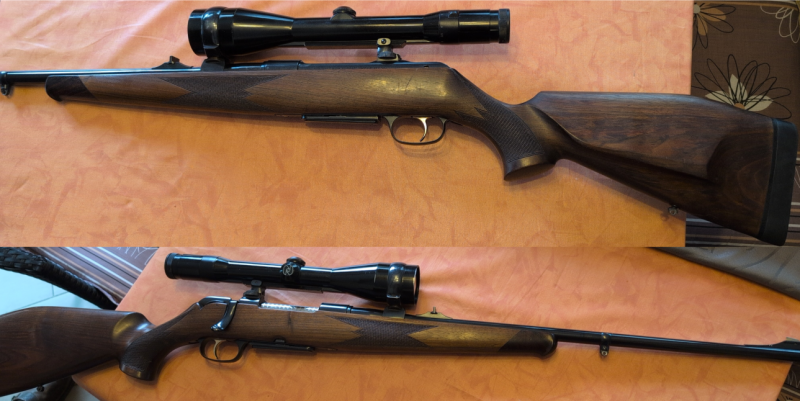 Mit Visierung, gesamtlänge 113 cm, Hinterschaft bis Abzug 36,5 cm, Gummischaftkappe, Edelholzabschlüsse an Pistolengriff und Vodershaftabschluss, Bester Laufinnenzustand, Ein Abzug mit Rückstecher, entnehmbares Magazin für 4 Patronen, dunkles Schaftholz.
