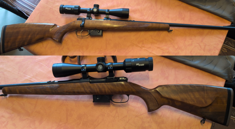 Ein Abzug mit Rückstecher mit Visierung (Kimme fehlt), Gesamtlänge 107 cm, Lauflänge 56 cm, Laufinnenprofil ohne jeden Vergang, montiert über Aufschubmontage mit ZF Sig-Sauer 3-9x40 mit Absehn 4 (ähnlich) Neuwertig. Waffe kaum benutzt!