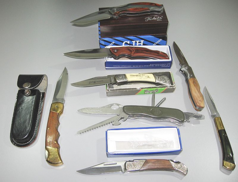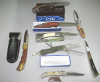 Das oberste Herbertz hat nur auf der einen Seite ein paar kleine Kratzer; das darunter nur einen kleinen Riss im Holz - beide sonnst unbenutzt und Funktion OK. Das darunter mit dem Schäferhundmotiv läuft etwas schwer in der Klinge; ist aber unbenutzt. Das Herbertz auf der linken Seite ist in Ordnung ( aus der preiswerten Schiene ). Das Victorinox Soldatenmesser hat deutlich sichbare Gebrauchsspuren - beim Herbertz darunter sind BEIDE Griffschalen lose ( dennoch scheinbar wenig benutzt ). Das Nieto rechts unten ist ein Slipjoint ( die Klinge ist nicht arretierbar - von Haus aus ). Es ist sehr alt, zwar augensch. kaum/nicht benutzt - aber noch mit DM ausgezeichnet. Das Puma Tec darüber ist defekt ( BackLock arretiert nicht ) - wenn man den Stift geöffnet oben runterdrückt, bleibt er unten und arretiert - dennoch DEFEKT .