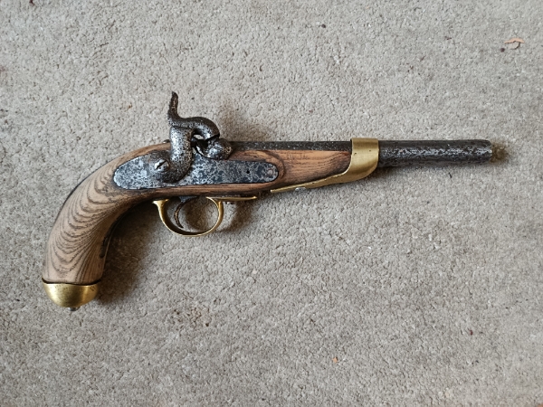 Badische Kolbenpistole M.1858 aus Bodenfund,ohne jede Funktion.Rostnarbig,teilweise ergänzte Schrauben,Truppenstempel vom II.badischen Dragoner Regiment.Auf der Schloßplatte gestempelt GH (Haenel,Suhl)Ich habe sie nicht zerlegt,kann also nichts dazu sagen wie es innen Aussieht.Als Belegstück oder abschreckendes Beispiel.Privatverkauf,keine Garantie , Nachverhandlung oder Rücknahme .Mit der Abgabe eines Gebotes erklären Sie sich damit einverstanden.