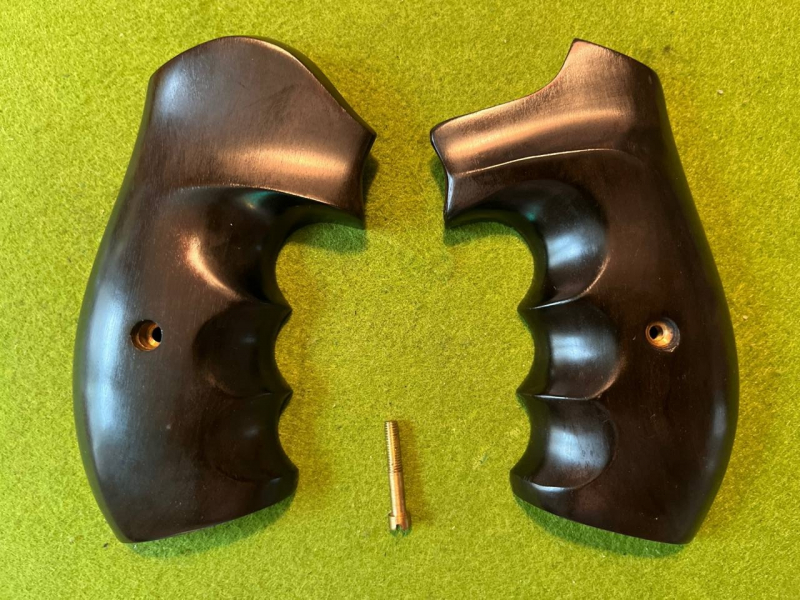 mit ihrer originalen Befestigungsschraube. Es handelt sich um eine hochwertige Ausführung mit Daumenauflage für Rechtshänder, aus hartem Edelholz und mit durchgehender Schraube.