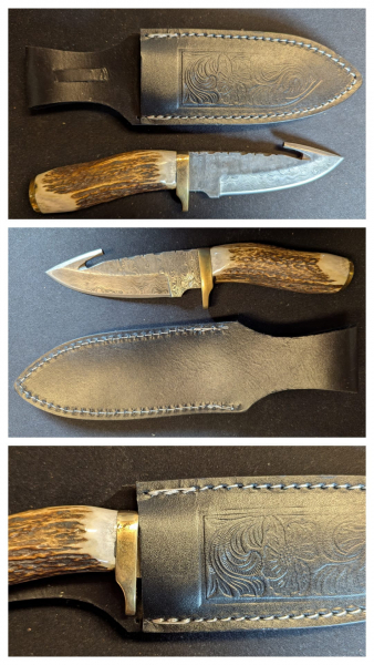 Solides Jagdmesser mit Damastklinge Horngriff und dicker Leder Scheide Länge ca 23 cm siehe Bilder