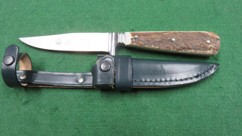 1 Originaler Puma " GNICKER 11 3596 " das Messer ist neu und unbenutzt, mit grüner Sattellederscheide und sehr schönen Hirschhorngriffschalen.