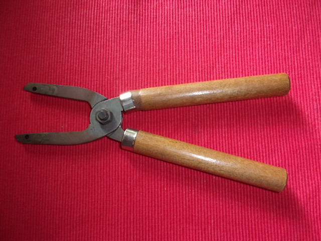Kokillengriff, groß, für Mehrfachkokillen, Gesamtlänge: 27cm, Holzgriffe, Stahl, Backenlänge 7cm.