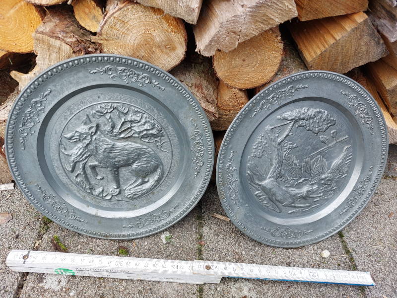 Aus Nachlass werden zwei dekorative Teller vermutlich aus Zinn verkauft