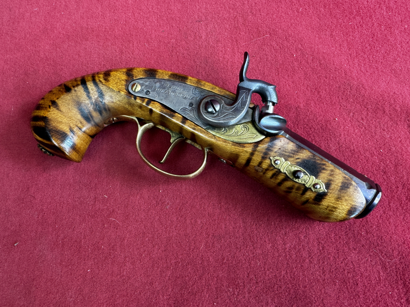 Es handelt sich hier um einen Derringer Philadelphia im cal.: .45, Jukar, gezogener Lauf, ungeschossen, Holz Tiger