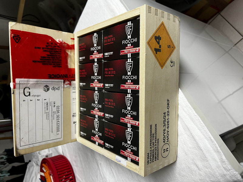 Biete eine neu erworbene Holzkiste mit 12000 Fiocci Zündhütchen an 23 einzelne Zündhütchen fehlen habe sie getestet leider schlagen Sie in meiner getunten extrem schwache Schlagfeder Reifle nicht zuverlässig ab .