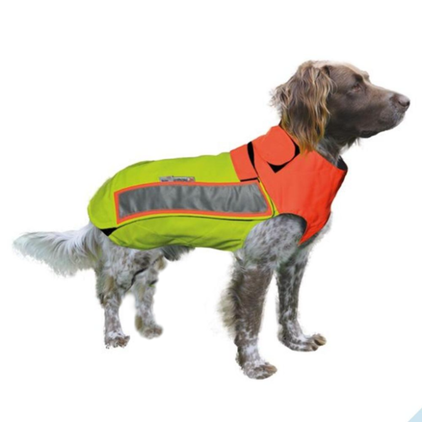 Aus strapazierfähigem und reißfestem Cordura, Innenseite komplett mit KEVLAR ausgestattet. Sehr leichtes, softiges Netzinnenfutter, Einstieg für Vorderläufe mit weichem Softshell/ Neopren gepolstert.Verschluss für Rückenteil dreifach gesichert, extra Sicherung des Klettverschlusses am Hals. Signalgelb und -orange mit Reflektorstreifen
