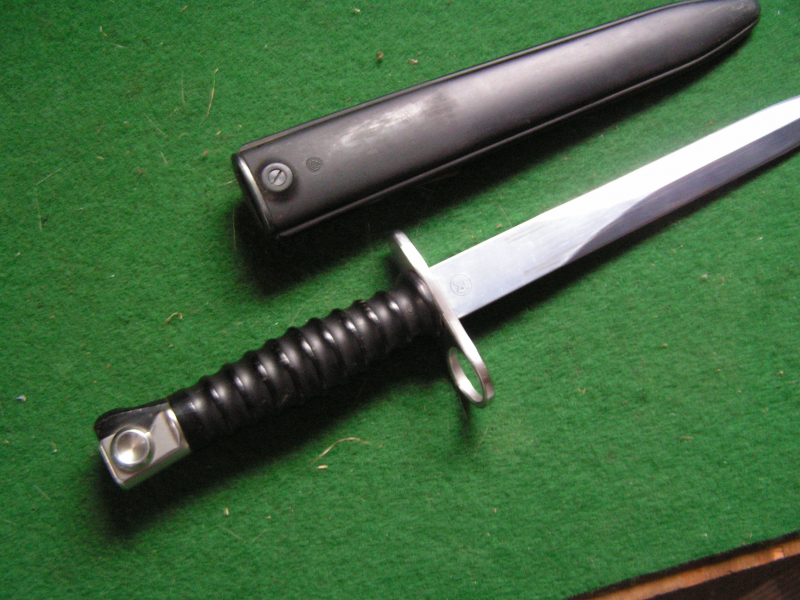 Aus einem Nachlass ein Schweizer Bajonett Modell M57 mit Scheide. Die Klinge ist einseitig mit Victoria Schwyz 20102 gestempelt. Die andere Seite zeigt F über W+ im Kreis.Die Scheide weist ein paar Tragespuren auf.