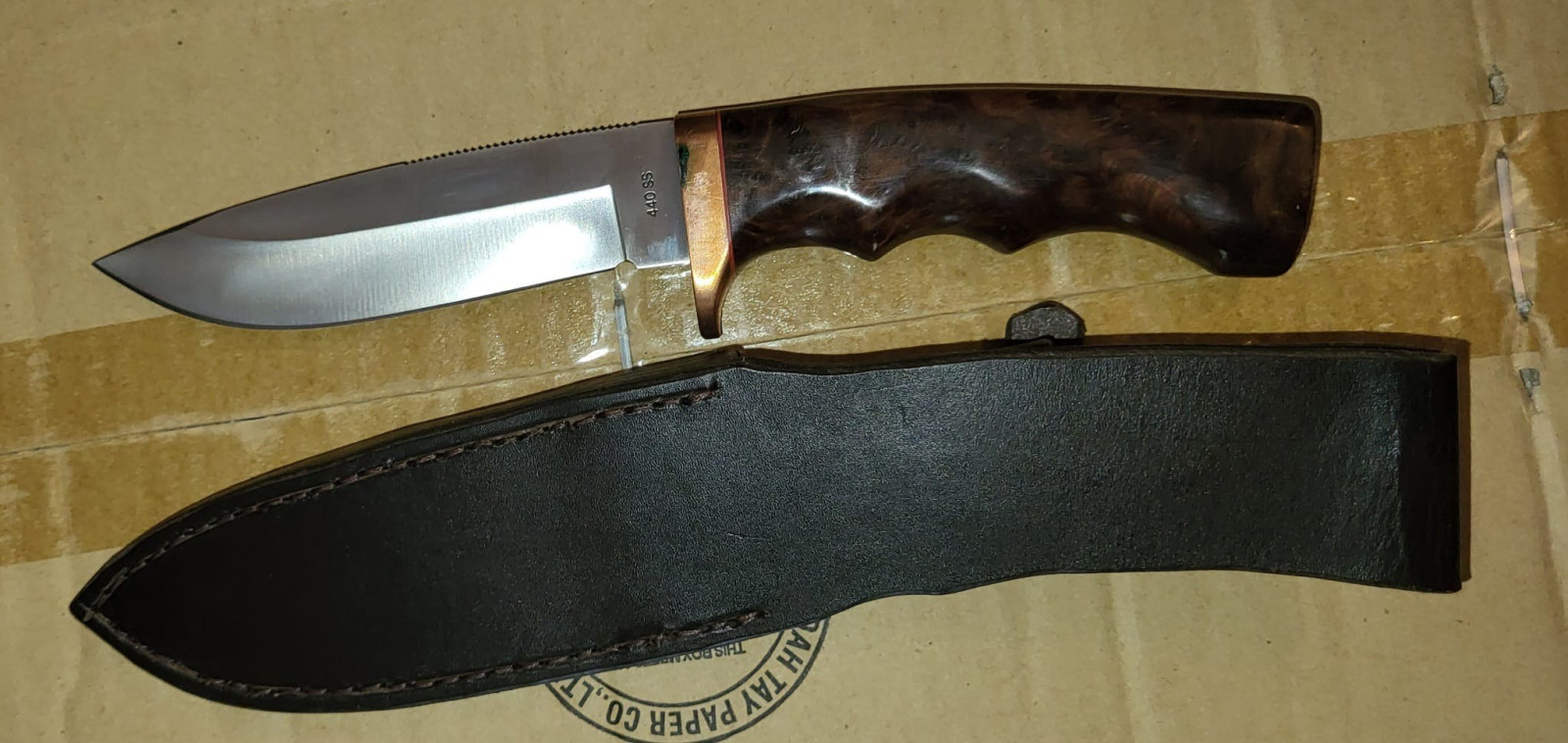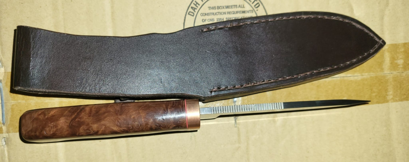 Lederscheide: Die ursprüngliche Nylonscheide wurde ersetzt durch eine angepasste, handgemachte Naturleder-Köcherscheide in Schwarz.