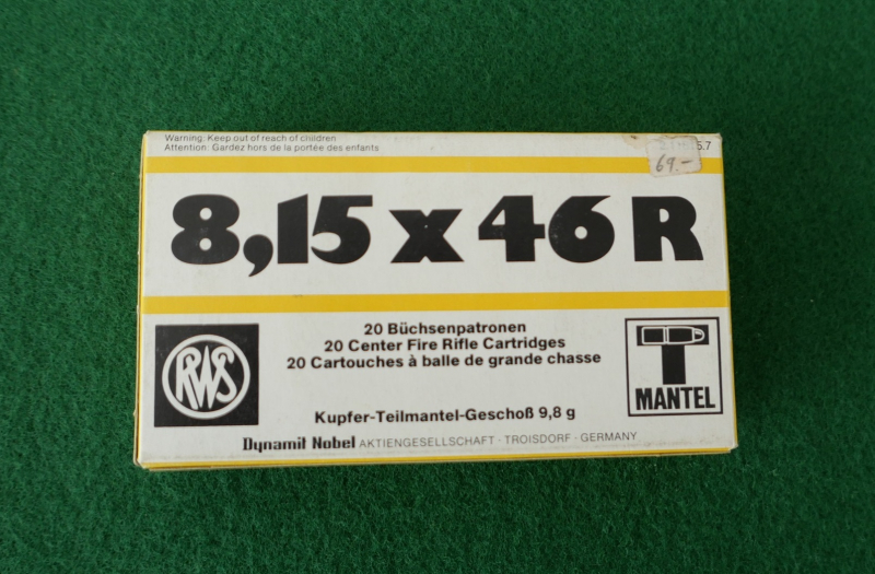 Verkauft wird eine originale Packung mit 20 originalen RWS-Patronen im Kaliber 8,15x46R. Die Geschosse dieser RWS-Patrone haben den Durchmesser Diameter .323. Ich selbst habe diese Patronen vor Kurzem hier bei EGUN erworben, kann diese Patronen leider nicht verwenden, denn der Lauf meiner Waffe verlangt den Geschoss-Diameter .318. Achtung: Der Versand in das EU-Ausland ist teurer. Kein Versand nach Rumänien, Bulgarien, Grichenland, Malta. Dies ist ein Privat-Verkauf, daher keine Rücknahme, keine Garantie. Besichtigung ist möglich, ebenso persönliche Abholung.
