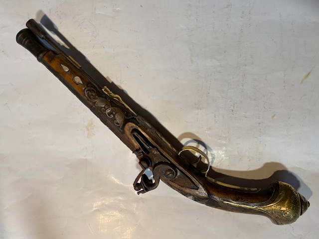 1 Steinschloß Pistole - mit Nummer 1 - sehr schöne Einlegearbeiten und Gravuren - Laufdurchmesser ca.13mm - 45cm lang - Alles in sehr gutem gebrauchten Zustand - Paketversand 12,50 Euro mit DHL in der BRD - Bei unversichertem Versand übernehme ich keinerlei Gewährleistung. Bei Geboten auf weitere Artikel Unkosten erfragen. Unklarheiten vorher klären und nicht hinterher beschweren. Mit Abgabe des Gebotes akzeptieren Sie die angegebenen Versand und Unkosten sowie die Verkaufsbedingungen.
