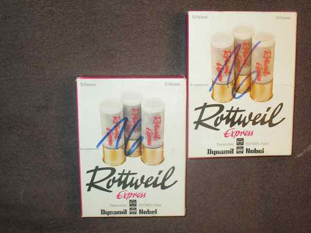 20 Schrotpatronen, Rottweil Express Kaliber 16/67,5, 10 Stück in 4,5mm u. 10 Stück in 7,9mm
