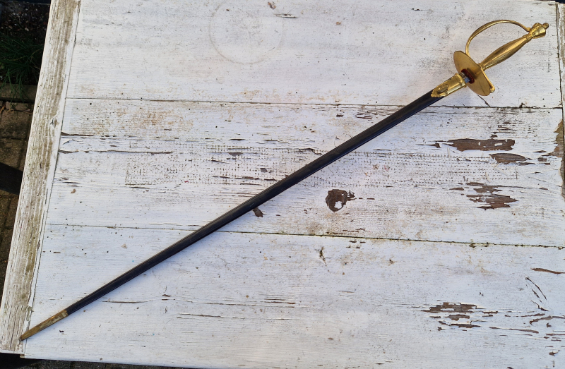 Beamtendegen britischer Art. Lederscheide leicht geschrumpft, Klinge Flugrostig.