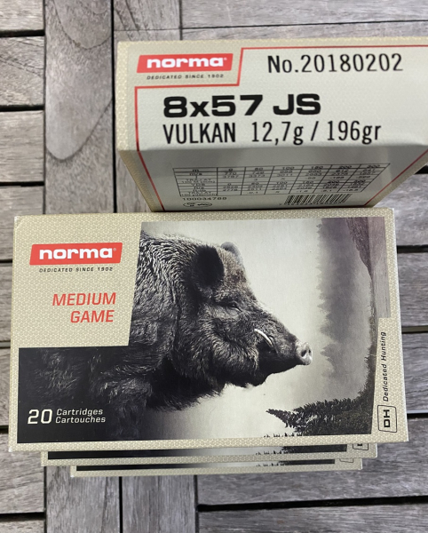 Sie bieten auf 4 neue Packungen 8x57JS Norma Vulkan 12,7 Gramm einer Charge. Die Patronen können gegen Vorlage einer Erwerbsberechtigung vor Ort abgeholt werden.