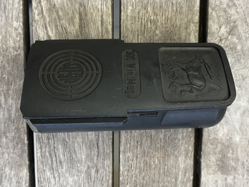 Sie bieten auf ein 5-schüssiges Steyr Makrolon-Magazin für das Kaliber 300 Winchester Magnum. Seitliche Drücker. Funktion einwandfrei. Die Versandkosten gelten für Österreich.