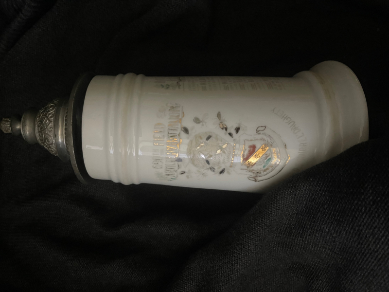 Bataillonkrug USA, 2. Weltkrieg. Original. Kein Vitrinenobjekt, anscheinend wurde oft gebraucht, s. Zustand: Farbe gut abgetragen. Reparaturstelle auf dem Zinndeckel. Porzellan ist nicht beschädigt. Schönes Bodenbild.