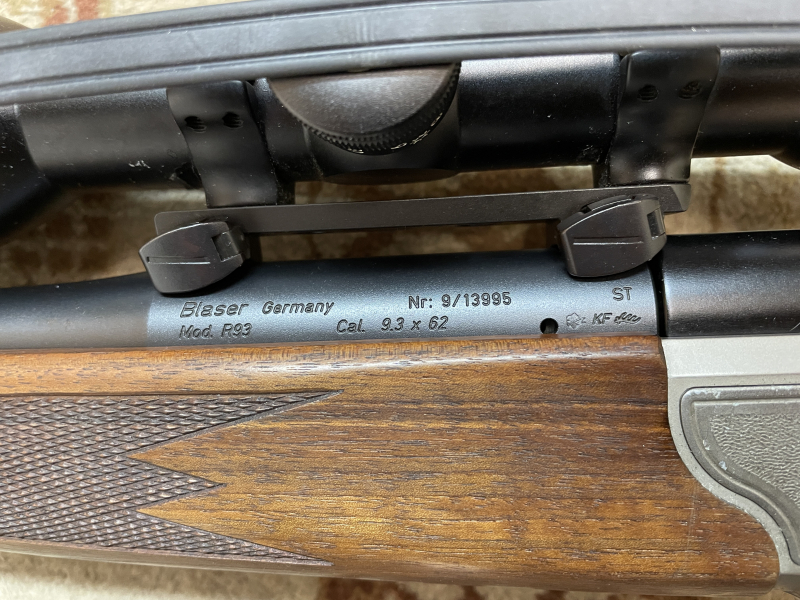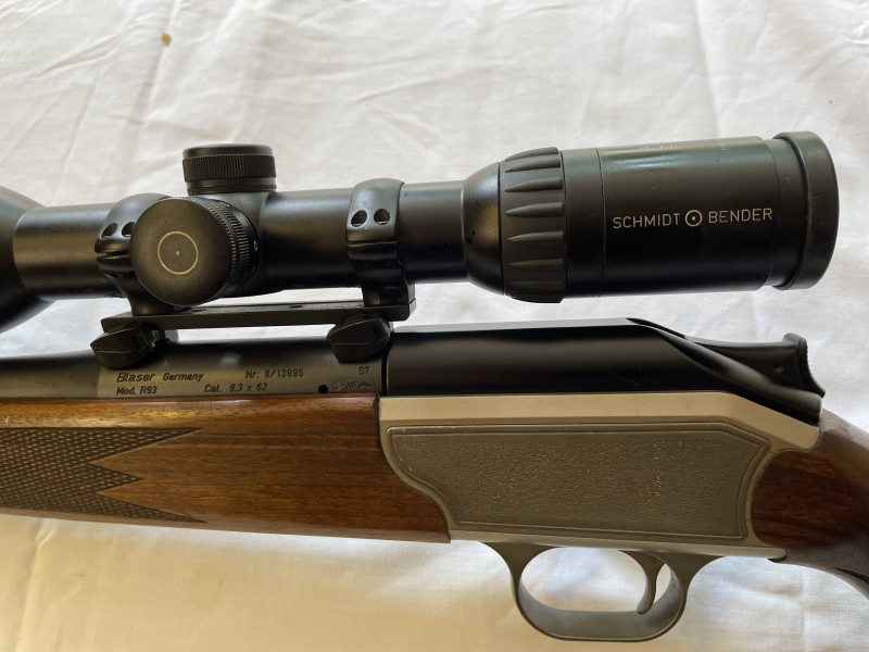 Verkaufe eine Rep.-Büchse Fa. Blaser Modell 93 im Kal. 9,3x62. Die Waffe hat einen Holz-Schaft, mit Backe, Kunststoffkappe und Riemenbügel abnehmbar. Der Lauf ist 58cm lang mit offener Visierung, innen blank. Gesamtlänge ist 102cm, Abzug 37cm und ZF 33cm. Montiert ist mit einer Original Blaser Sattelmontage ein Schmidt & Bender Zenith 2,5-10x56 mit Leuchtpunkt 11Stufen und Klarsichtschutzkappe. Brünierung und Schaft sind gut. Verkauft wird nur gegen Vorlage einer gültigen Erwerbsberechtigung (EWB) und Vorlage der NWR- ID-Nr.: P + E!
