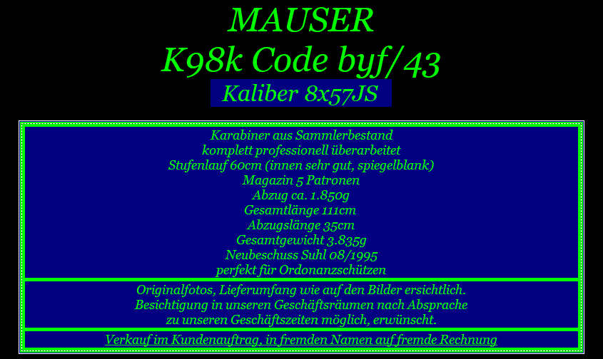 Artikel-ID: 20137896  •  ArtikelNr. des Verkäufers: 12108  •  Kategorie: Sportgewehre > Ordonnanzwaffen