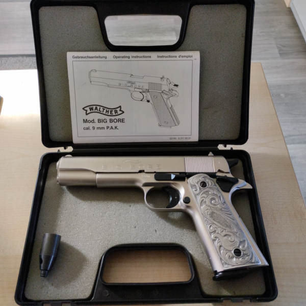 Ich verkaufe hier eine Walther Bigbore 9mm P.A.Knall in der Ausführung vernickelt, Arabesken Griffschalen!
