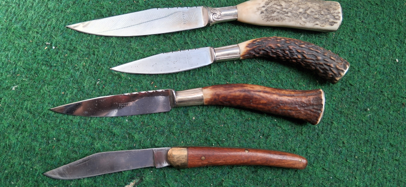 4 Stück Jagdl.Messer Nikker.3 stück mit Hirschhorngriffen.Das klappmesser mit Holzgriffschalen