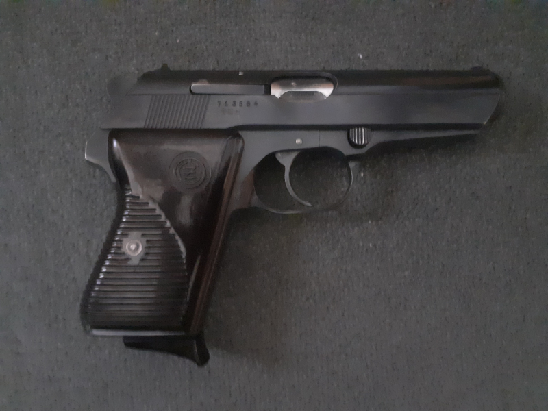Angeboten wird eine wunderschöne CDS B70 in nahezu fabrikneuem Zustand. Ehrenreich hat diese Waffen Anfang der Achtziger aus scharfen tschechischen 7,65 Pistolen CZ Vzor 50 / 70 in 8mmk Gaspistolen umgebaut. Dieses Exemplar ist dabei besonders schön. Im Gegensatz zu den späteren eher rustikal verarbeiteten Exemplaren hat dieses noch die schönen Bakelitgriffschalen und eine Glanzbrünierung, die sich vor Walther-Pistolen nicht verstecken muss. Ich habe schon einige dieser Umbauten gesehen, aber dies ist die mit Abstand schönste CDS B70, die ich in Händen hatte. Dazu gibt es eine OVP der CZ70 mit Anleitung und Putzstock (Pappeinlage minimal beschädigt) sowie ein passendes Schulterholster. Eine sehr schöne Gelegenheit für Sammler. Die Waffe ist wirklich in nahezu perfektem Zustand. Ich trenne mich sehr ungern! Flecken auf dem Foto sind Spiegelungen des Waffenöls. Beachten Sie meine Bewertungen! Ich verkaufe nur beste Ware!