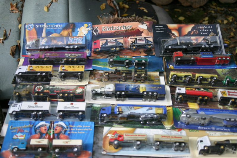 Aus grossem Nachlass-18 stk. ---verschiedene LKW mit Werbeaufdruck --s Foto-- Länge Blisterpacks ca 20-25 cm -- angestaubt mal saubermachen----demnächst noch mehr--die genauen Typen entnehme man dem Foto--auktion umfasst nur die Modelle in der OVP--