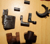 Verschiedene Teile für Luger Pistole 08, (Verriegelung, Deckblatte, Bolzen, Feder, teils rostnarbig, Holzboden für Magazin 08 (nachgemacht)
