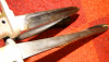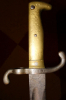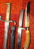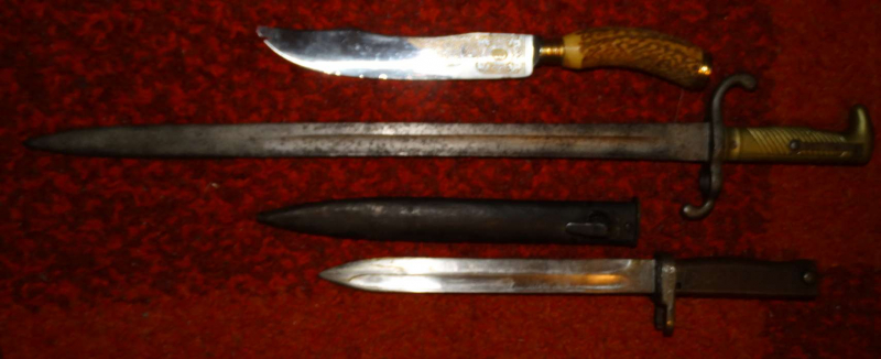 2 Bajonette und ein Vorlegemesser (Griff Hirschhorn, Klinge teilvergoldet, Herst.: Anton Wingen, Solingen), Mod. 71, Kammerstück mit Abnahme von 1874, Stempel 7.R.R.1.24 auf Parierstange, Klinge fleckig, leicht rostig. Notbajonet in relativ gutem Zustand, blanke Klinge.
