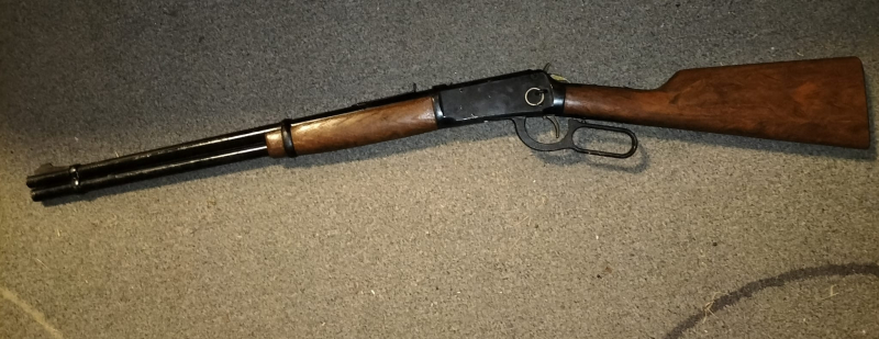 Luftgewehr Hersteller: Daisy, Modell: 1894 Unterhebelrepetierer, Kaliber: 4,5mm Rundkugel / Steel BB. Beschriftung UMAREX und F im Fünfeck auf dem Spannhebel. Spannen und Abfeuern i.O., der Lack ist an einigen Stellen an Lauf und Magazinröhre abgeblättert. Abholung vor Ort und Begutachtung der Ware erwünscht; Versandkosten wie angegeben. Verkauf im Auftrag aus Nachlaß; keine Rücknahme.