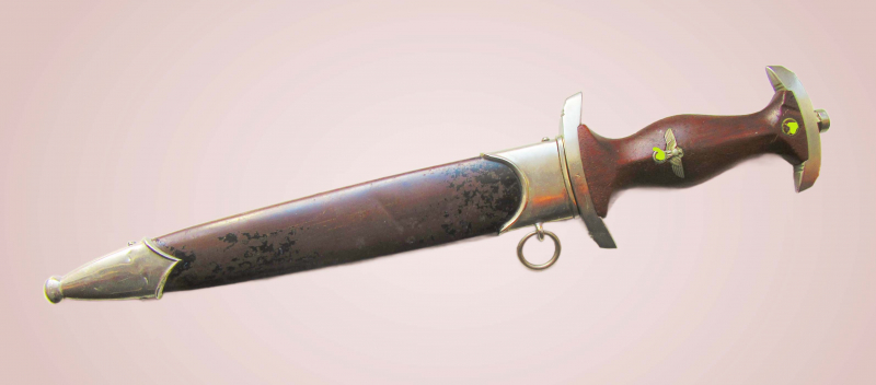SA oder NSKK Dienst Dolch Sauer J. P. & Sohn Suhl 1751- frühe Fertigung mit dazugehörende Scheide. Original Zustand. Die Klinge ohne Narben (glänzt) und sitzt sehr gut in der Scheide. Alle Teile zusammengehörig. Die Devise gut fühlbar 100% Original. Die Kugel an der scheiden Spitze ist in ordnung. Das sieht nur auf dem Foto verformt aus. Mit Gruppenstempel „Fr für Franken teils zu sehen“. Oben am Griff Holz und unten an Beschlag leichte Dellen. Im ganzen guter Zustand. Privat Verkauf. Versand: Deutschland 6,50 € (über 500 € + 6,99 € Zusatzversicherung). EU Ausland 14,50 € (über 500 € + 14 € Zusatzversicherung). Andere Länder nach DHL Tabelle (Versichertes Paket).