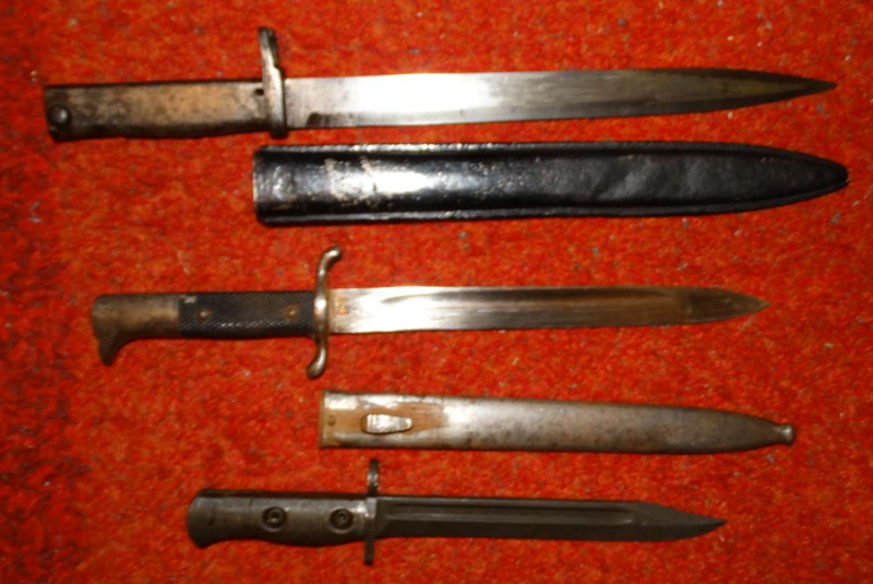 3 Bajonette - Notbajonett, blanke Klinge, auf Parierstange Abnahme (?) W mit Krone? und 24 , Scheide mit Kennzeichnung ?ag, Feuerwehr Ausgehstück,