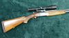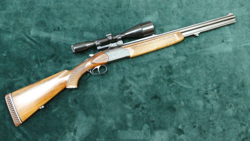 Brünner (CZ) Bockbüchsflinte Mod. 502.4, Kal. .222Rem. und 12/70, altersgemäß sehr guter Zustand, per Aufschubmontage ist ein Jena 8x56 mit Absehen 4 (unbeleuchtet) montiert, Höhen- und Seitenverstellung (Klickrasterung) leichtgängig. Beschuß 1985. Schußleistung siehe Bild: 5 Schuß mit 3,24g RWS TM auf 100m, Läufe innen weitgehend blank (der Schrotlauf hat ein paar kleine Schatten, nichts tragisches), Lauflänge 60cm , Schaftlänge 37,5cm, Gesamtlänge 104,5cm. Rückstecher im vorderen Abzug. Schiebesicherung auf dem Kolbenhals.