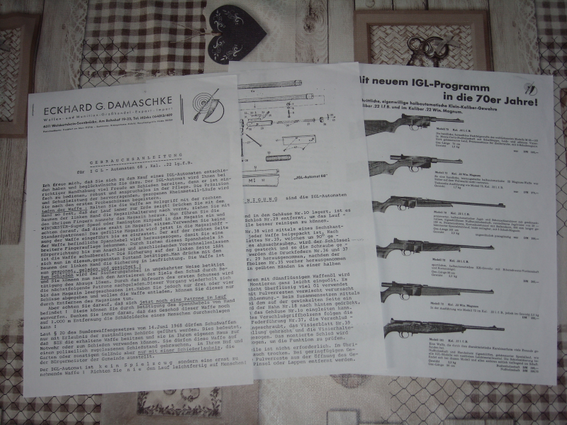 Sie bieten auf die Kopien einer Bedienungsanleitung / Reinigungsanleitung für den Landmann KK-Halbautomaten JGL-68. Das Konvolut besteht aus 4 einseitig bedruckten Blättern A4 in deutscher Sprache, es enthält auch eine Explosionszeichnung der Waffe. Auf einem Blatt werden neue Halbautomaten-Modelle vogestellt, welche in den 1970-er Jahren neu auf den Markt kommen sollten. Alles stammt aus Nichtraucherhaushalt. Privatverkauf, keine Garantie, keine Rücknahme.