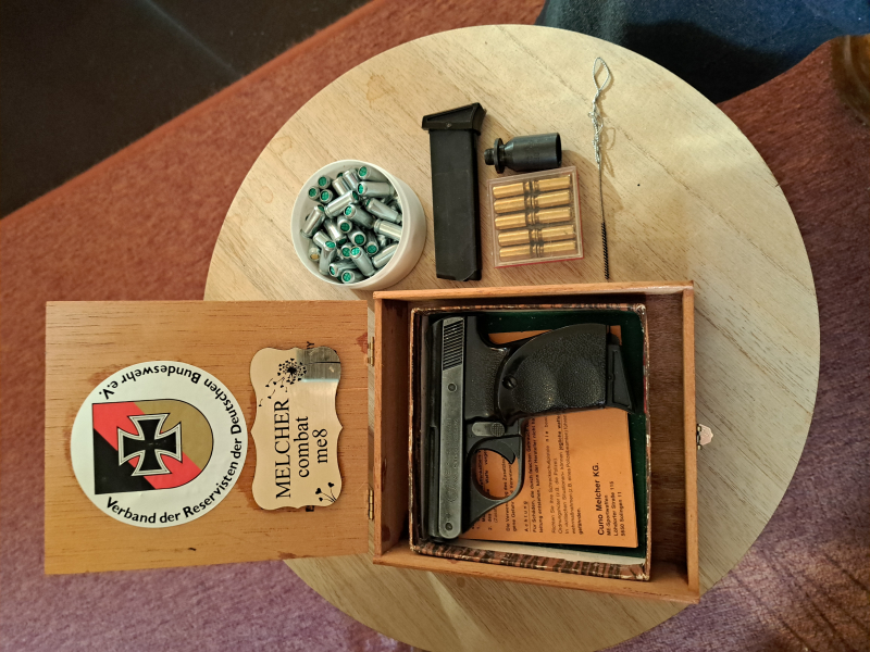 Verkqaufe Melcher ME8 Combat 8mm Schreckschuß / Orginal Karton mit Aufkleber / mit 2 Magazine jeweils 8 Patronen fassend /