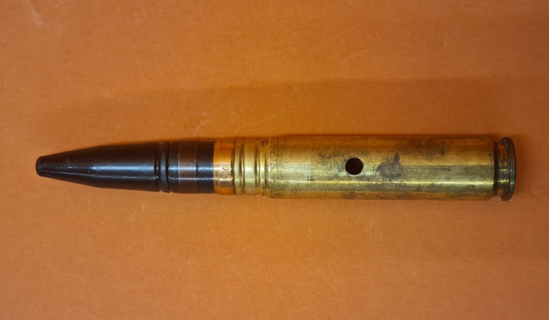 Angeboten wird eine russische Sammler-Patrone 23x115 БЗА/ BZA (API) Panzerbrechend-Brand als Schulungsversion für die Maschinenkanone AM-23. Es handelt sich um ein fabrikmässig hergestelltes Exerzier-/ Unterrichtsmodell ohne explosionsgefährliche Bestandteile. Es besteht aus den Einzelkomponenten Geschoss und Hülse. Die Messinghülse weist seitlich eine Bohrung auf, das Zündhütchen einen Körnerpunkt.Die Patrone ist nicht zerlegbar und nicht restauriert oder neu lackiert. Die Gesamtlänge beträgt ca. 200mm (Dekorations-/ Sammlerartikel)