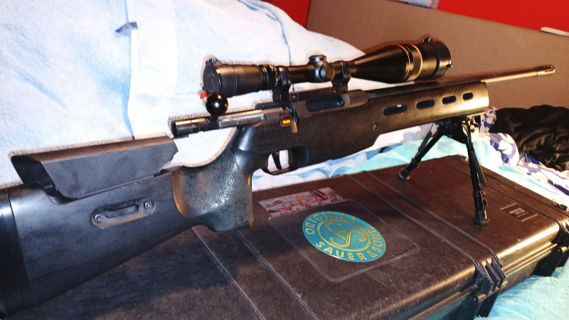 Eine sehr gepflegte Match-Repetierbüchse in technischem und optischem einwandfreiem Gesamtzustand. Lauf ohne erkennbare Schäden und Brünierung sehr gut und lediglich leichte Gebrauchsspuren. Schaftholz mit UIT-Schiene, 1x entnehmbares Magazin für 5 Patronen und ein passender Transportkoffer.