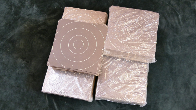 Einsteckspiegel (Schleede), 25x25cm, Durchmesser Innenzehner 50mm, Zehner 100mm, 5 ungeöffnete Originalpacks (je 250 Stück) + die Reste eines geöffneten Packs (hab ich nicht nachgezählt, viele fehlen aber nicht....).