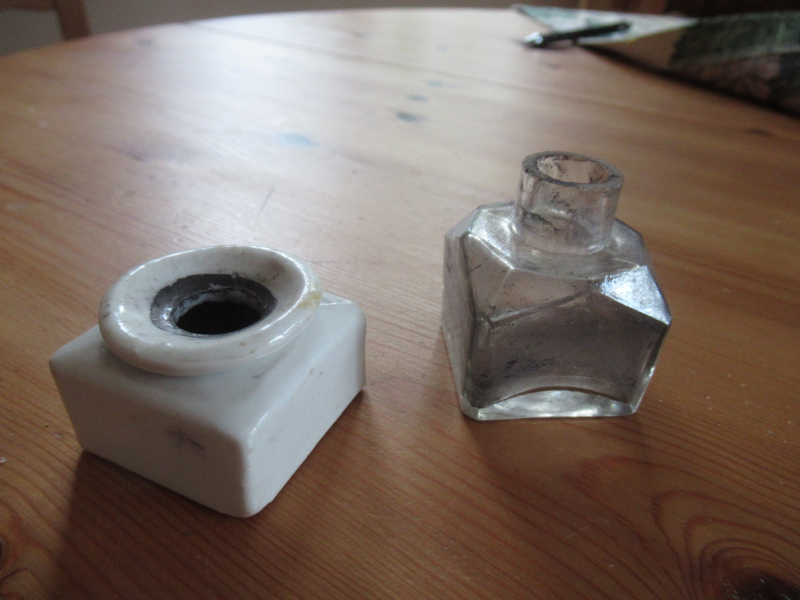 2 Stück antike Tintenfässer 1 x Glas, 1 x Porzellan