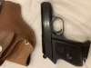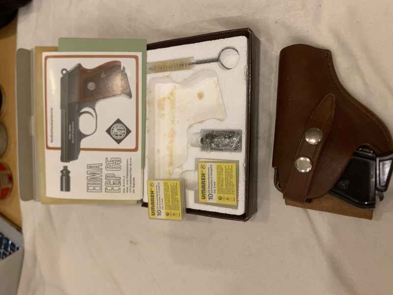 Original und ungeschossene Erma 8mm Knall inkl. Lederholster mit Gürtelclip. Original Schachtel mit Garantiekarte, Bedienungsanleitung und div. Zubehör- siehe Fotos. Ca. 40 Jahre alt.