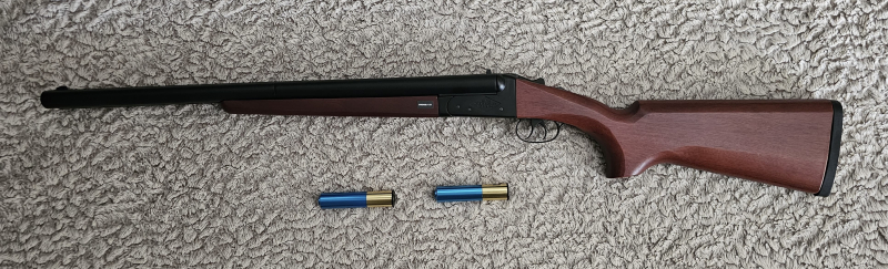 Zum Verkauf steht eine doppelläufige Airsoft Schrotflinte aus Vollmetall und Echtholz.