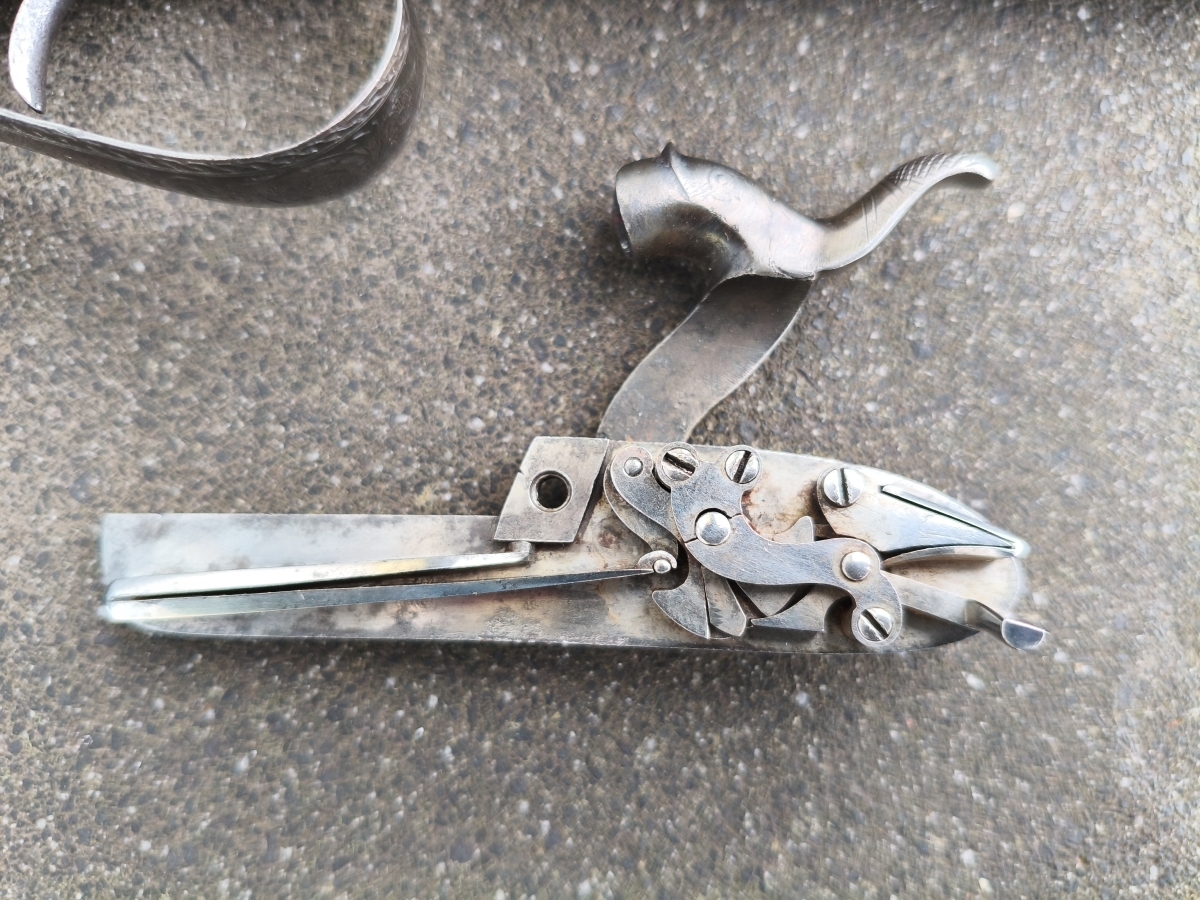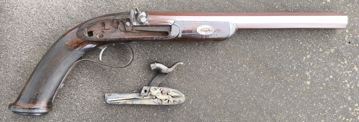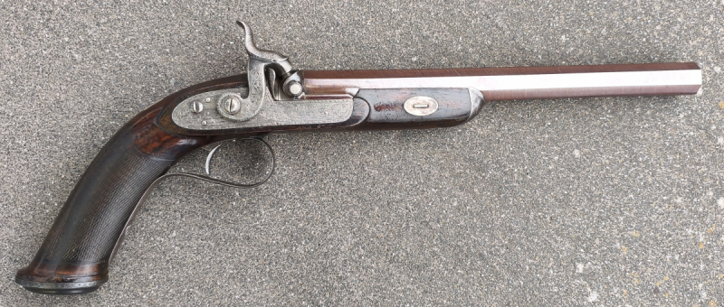 Braunierter achtkantiger Damastlauf, Kaliber ca. 13mm glatt. Oberseite signiert Dublin. Aushakbarer Lauf. Schloß in guter Funktion, mit Schiebesicherung, zwei Rasten sowie Fliege, gut gefederter Direktabzug, Innenansicht siehe Bilder. Nussholzhalbschaft. Eisenteile mit feiner Arabeskengravur. Gesamtlänge 42,5cm.