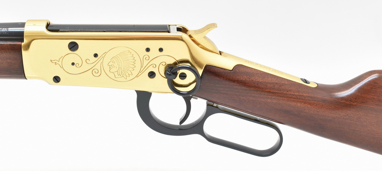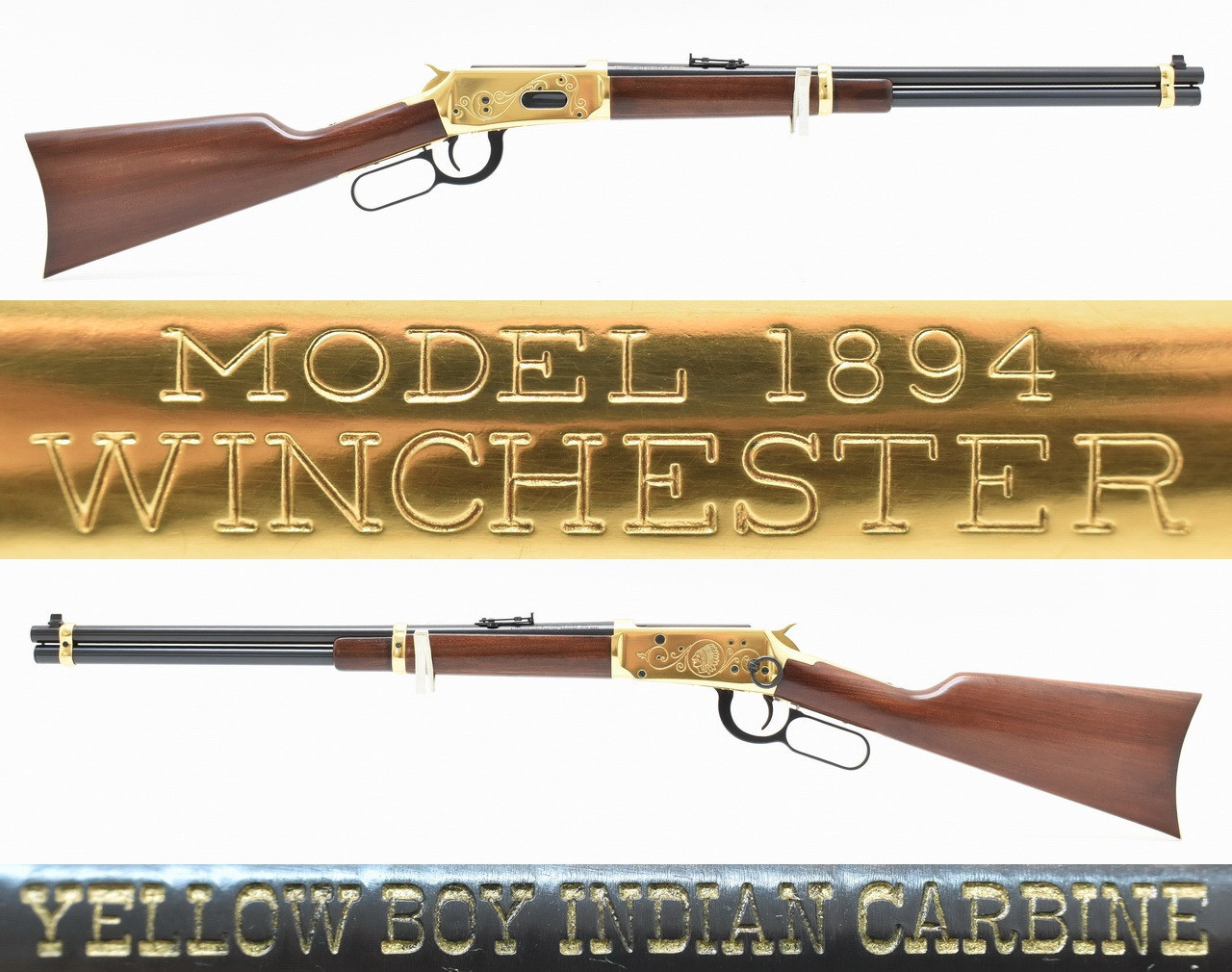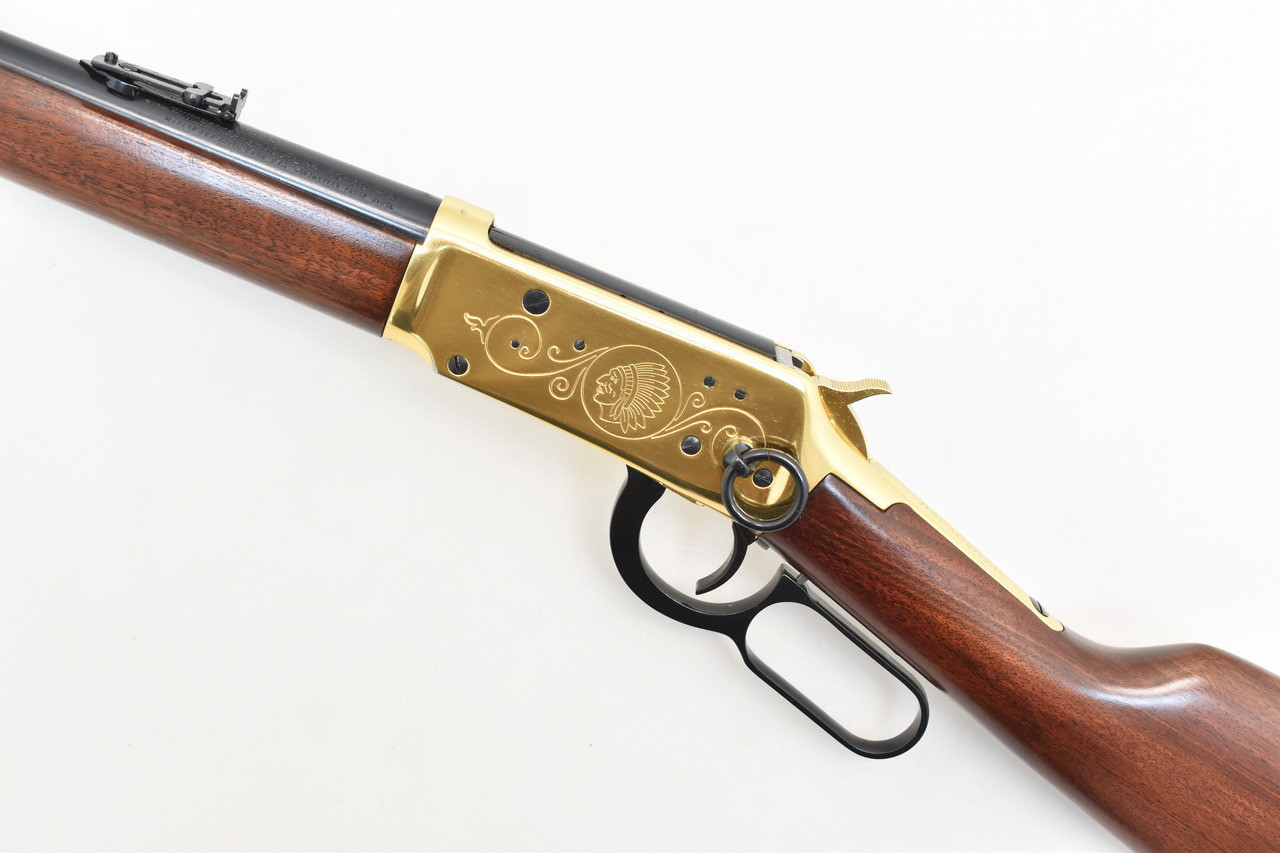 Leicht gebrauchte " Lever - Action Commemorative " / UHR Erinnerungswaffe des bekannten amerikanischen Herstellers WINCHESTER Modell 1894 " Yellow Boy Indian Carbine "; Auflagenhöhe von nur 5500 Stück. Das Modell " Yellow Boy " ist der Beginn der Winchester Indianer Serie und wurde speziell für den europäischen Waffenmarkt vorgestellt. Vergoldeter Systemkasten mit Gravuren. Schaftkappe, Hammer und die Haltebänder ebenfalls in vergoldeter Ausführung. Spiegelblanker Lauf. Kölner Beschuß 1972. 341mm langer Schaft für Rechts- und Linksschützen ( Schaftlänge gemessen vom Abzug bis Mitte Schaftkappe ). Details siehe Bilder.