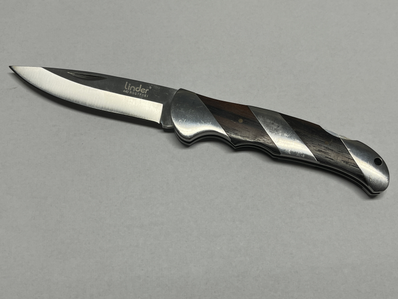 Ungewöhnliches Schließmesser mit rostfreien Griffschalen und Holz-