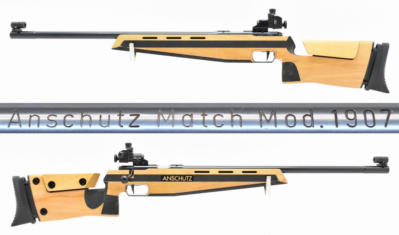 Gebrauchtes, einschüssiges KK - Scheibengewehr Modell 1907 aus dem Hause ANSCHÜTZ mit bewährtem Match 54 Verschluß. Spiegelblanker Präzisionslauf mit 24mm Mündungsdurchmesser. Ulmer Beschuß 1997. Einstellbarer Druckpunktabzug. Original Anschütz Präzisionsdiopter 7002. Korntunnel mit Adlerauge. Buchenschäftung für Rechtsschützen; Backe und Gummischaftkappe verstellbar. Details siehe Bilder.